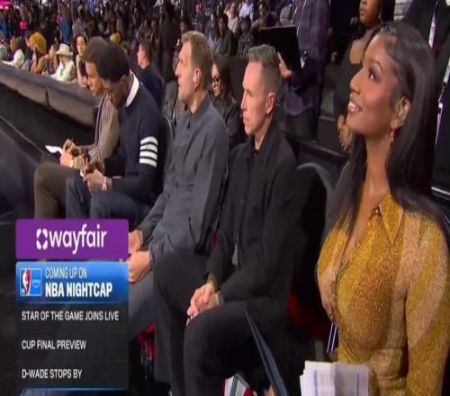 北京时间12月14日,在NBA杯半决赛俄克拉荷马雷霆以109-111不敌圣安东尼奥马刺的场边星光熠熠,不仅NBA名宿斯蒂夫-纳什、德克-诺维茨基以及格里芬出现在场边,在纳什身边坐着的NBA美女主持泰勒-鲁克斯也是被镜头捕捉下来,这个画面被不少球迷调侃“比场上更精彩”。